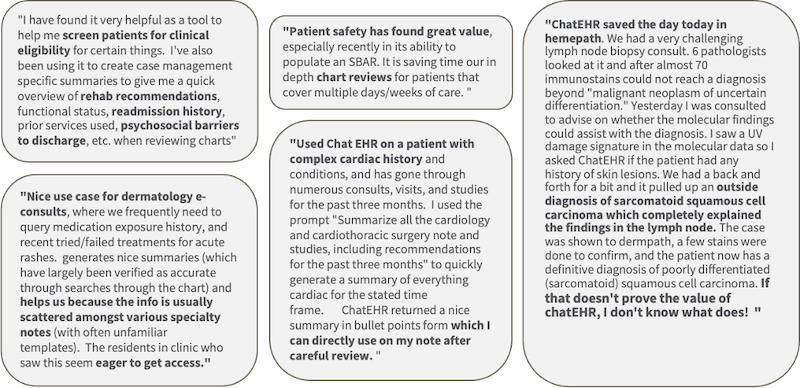 via a fixed prompt automation, which applies an existing set of criteria to a patient's record and returns a response based on that patient's record. Examples include decisions about transfer eligibility, referrals to certain services, and creating summaries of a hospital course of stay. About 60% of our usage is via automations.
