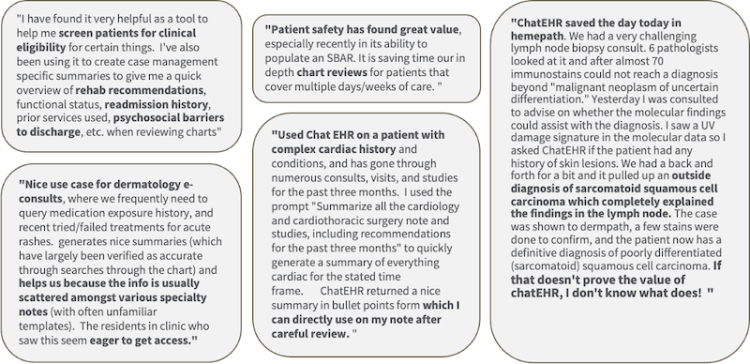 1. via a fixed prompt automation, which applies an existing set of criteria to a patient's record and returns a response based on that patient's record. Examples include decisions about transfer eligibility, referrals to certain services, and creating summaries of a hospital course of stay. About 60% of our usage is via automations.